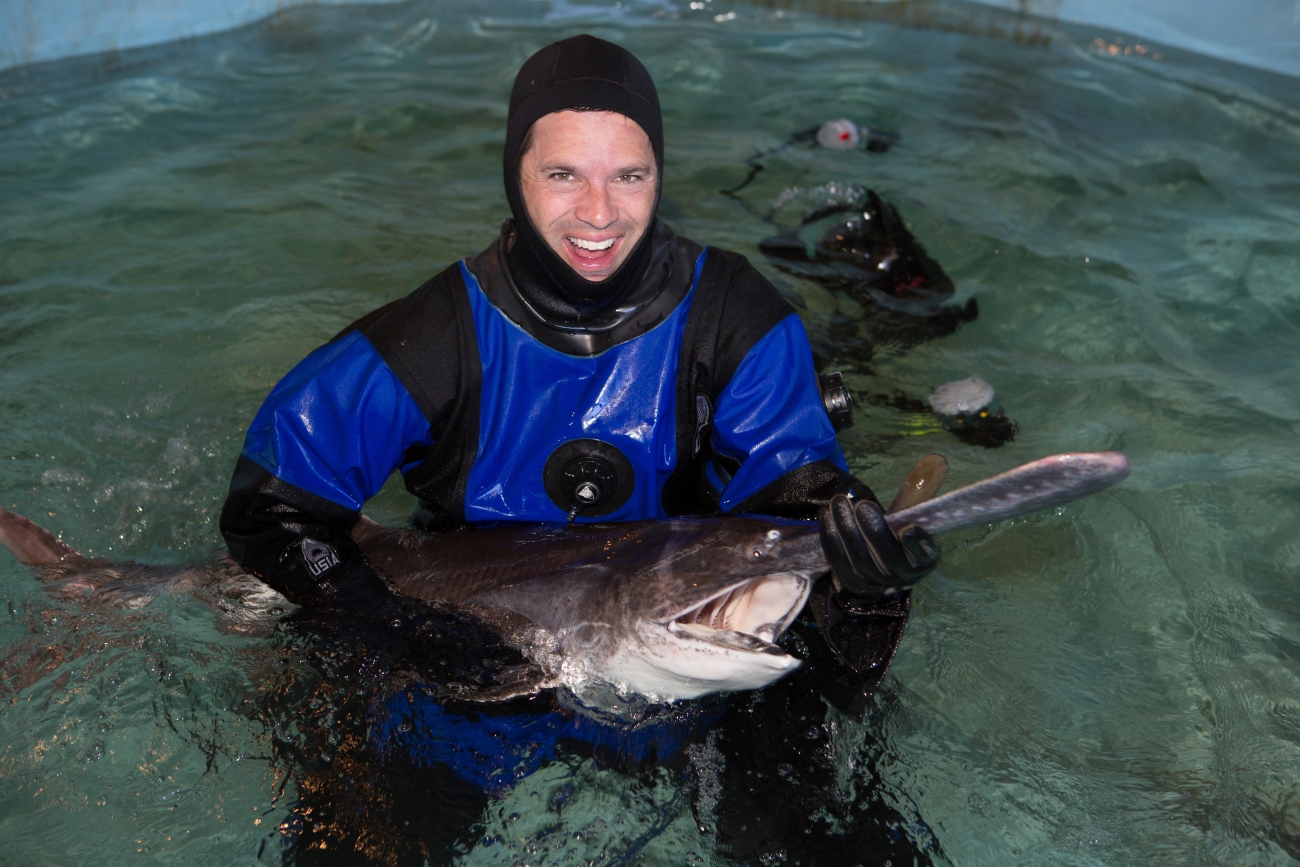 The paddlefish is a species of concern native to the Missouri, Ohio, and Mississippi Rivers. Paddlefish numbers have dropped in recent years due to dam construction, dredging, and over fishing in many areas. A diver and underwater photographer holding a paddlefish.