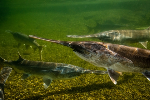 The paddlefish is a species of concern native to the Missouri, Ohio, and Mississippi Rivers. Paddlefish numbers have dropped in recent years due to dam construction, dredging, and over fishing in many areas.