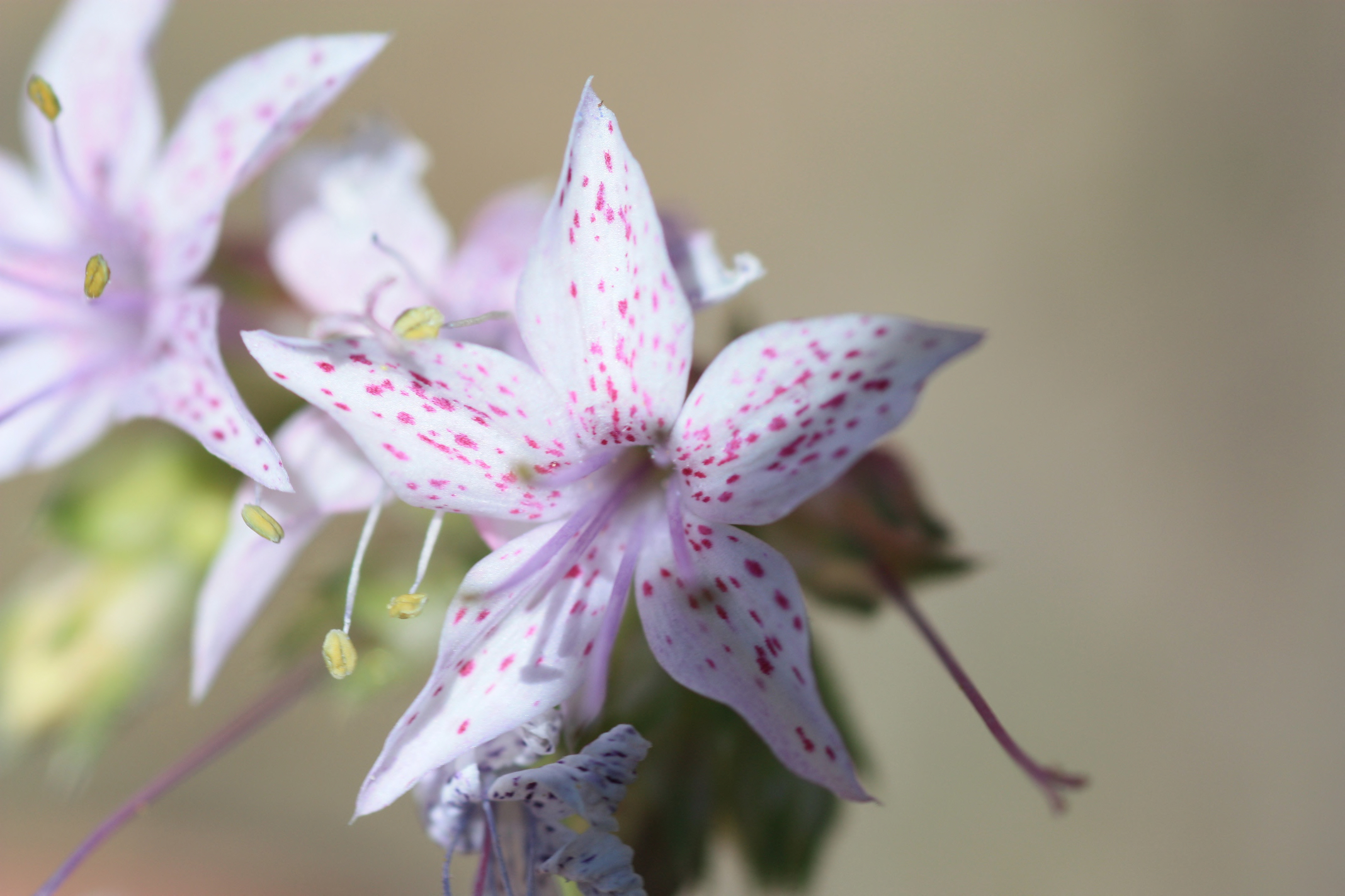 Ipomopsis polyantha is an herbaceous biennial 12 to 24 inches (in) (30 to 60 centimeters (cm)) tall, branched from near the base above the basal rosette of leaves. Deeply divided leaves with linear segments are scattered up the stem. Stems and flower clusters are covered with glandular hairs. Flower clusters are along the stem in the axils of the leaves as well as at the top of the stem. The white flowers are 0.4 in (1 cm) long, with short corolla tubes 0.18 to 0.26 in (0.45 to 0.65 cm) long, and flaring corolla lobes flecked with purple dots (Anderson 1988, p. 3). These dots are often so dense that they give the flower a pinkish or purplish hue. The stamens extend noticeably beyond the flower tube, and the pollen is blue (Grant 1956, p. 353), changing to yellow as it matures (Collins 1995, p. 34). Seeds form a mucilaginous (secreting sticky mucous) coat after they are wet. Seeds germinate much faster in Mancos Shale soil than in potting soil (Collins 1995, p. 72). Mature seeds germinate to form rosettes that produce flowering stalks during the next growing season, or they may persist as rosettes for a year or more until conditions are right for flowering. Plants produce abundant fruits and seeds, but have no known mechanism for long-distance dispersal (Collins 1995, pp. 111–112). After seeds are mature, the plants dry up and die. We do not know how long the seeds remain viable.