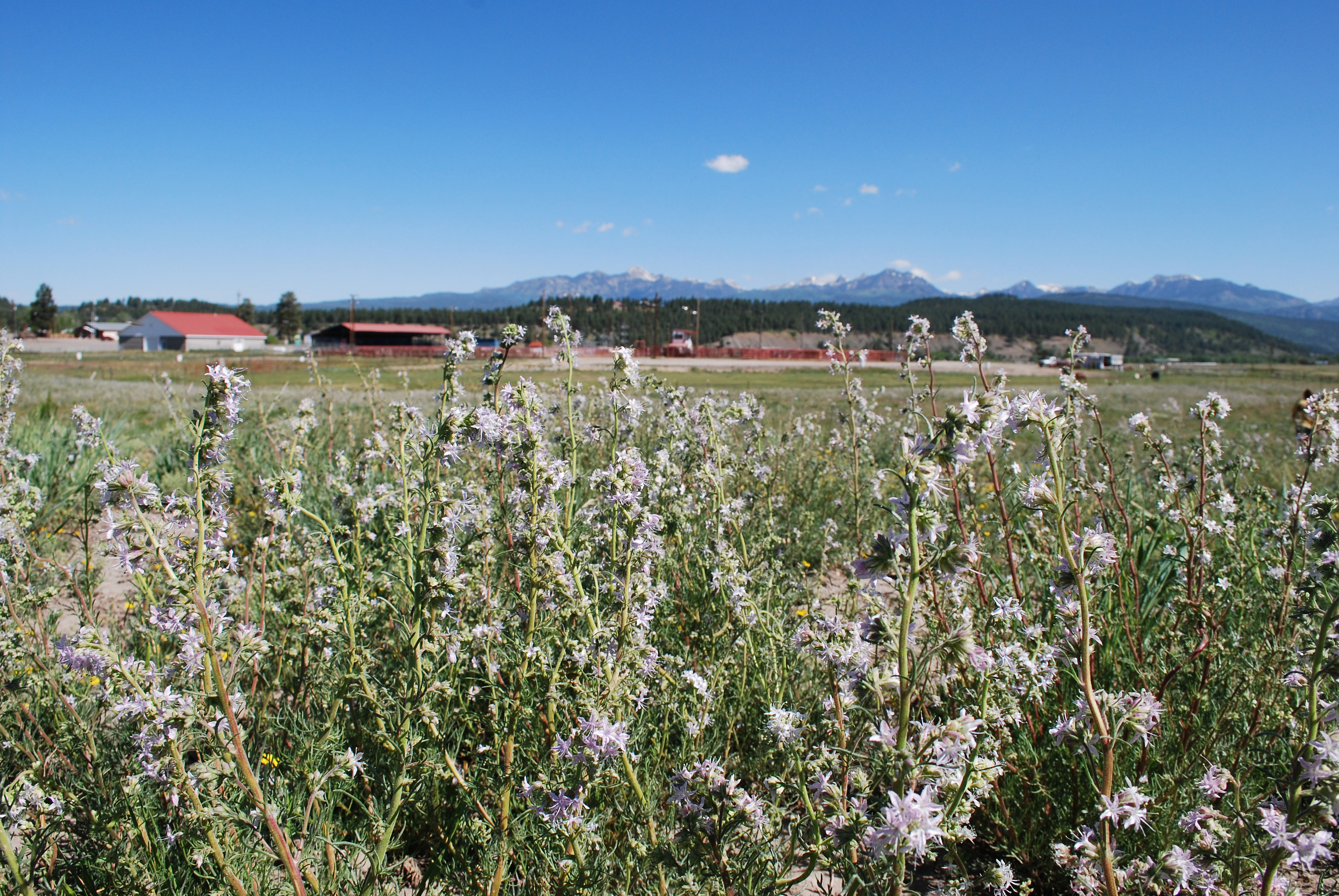 Ipomopsis polyantha is an herbaceous biennial 12 to 24 inches (in) (30 to 60 centimeters (cm)) tall, branched from near the base above the basal rosette of leaves. Deeply divided leaves with linear segments are scattered up the stem. Stems and flower clusters are covered with glandular hairs. Flower clusters are along the stem in the axils of the leaves as well as at the top of the stem. The white flowers are 0.4 in (1 cm) long, with short corolla tubes 0.18 to 0.26 in (0.45 to 0.65 cm) long, and flaring corolla lobes flecked with purple dots (Anderson 1988, p. 3). These dots are often so dense that they give the flower a pinkish or purplish hue. The stamens extend noticeably beyond the flower tube, and the pollen is blue (Grant 1956, p. 353), changing to yellow as it matures (Collins 1995, p. 34). Seeds form a mucilaginous (secreting sticky mucous) coat after they are wet. Seeds germinate much faster in Mancos Shale soil than in potting soil (Collins 1995, p. 72). Mature seeds germinate to form rosettes that produce flowering stalks during the next growing season, or they may persist as rosettes for a year or more until conditions are right for flowering. Plants produce abundant fruits and seeds, but have no known mechanism for long-distance dispersal (Collins 1995, pp. 111–112). After seeds are mature, the plants dry up and die. We do not know how long the seeds remain viable.