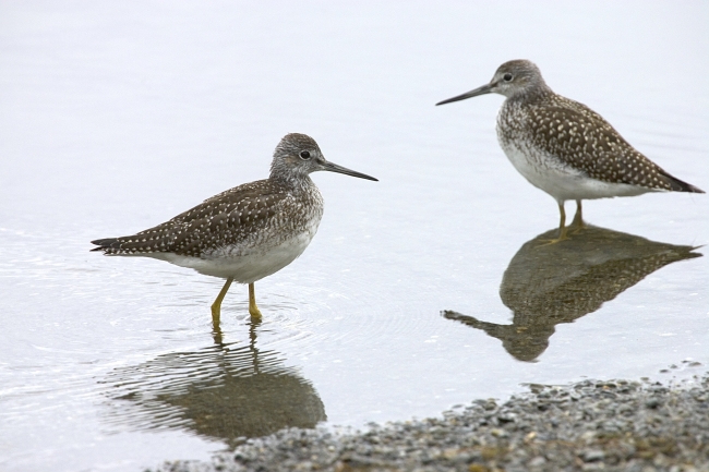 Pair of lesser yellowlegs with reflections in the water at Kenai National Wildlife Refuge.