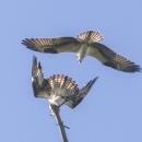 A pair of nesting ospreys fly above a nest in a large snag. The freshwater swamps found in the Ma-le'l Dunes provide habitat for these and other bird species. Credit: Andrea Pickart/USFWS