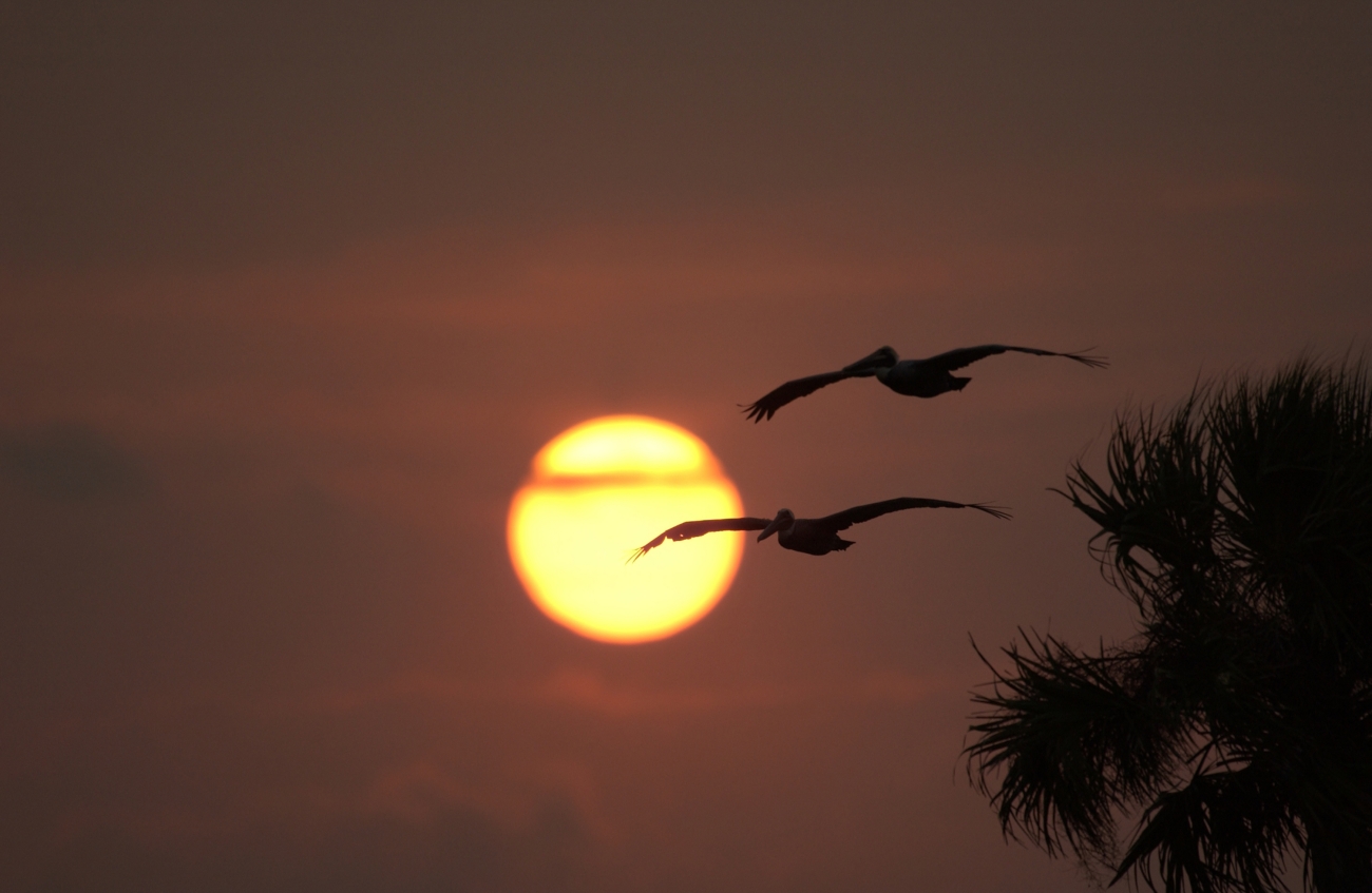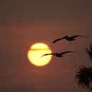Pair of Pelicans flying by a vibrant setting sun at Merritt Island National Wildlife Refuge.