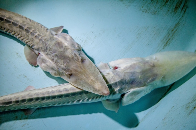 Pallid sturgeon have a flattened shovel-shaped snout; a long, slender, and completely armored caudal peduncle (the tapered portion of the body which terminates at the tail); and lack a spiracle (small openings found on each side of the head) (Forbes and Richardson 1905).