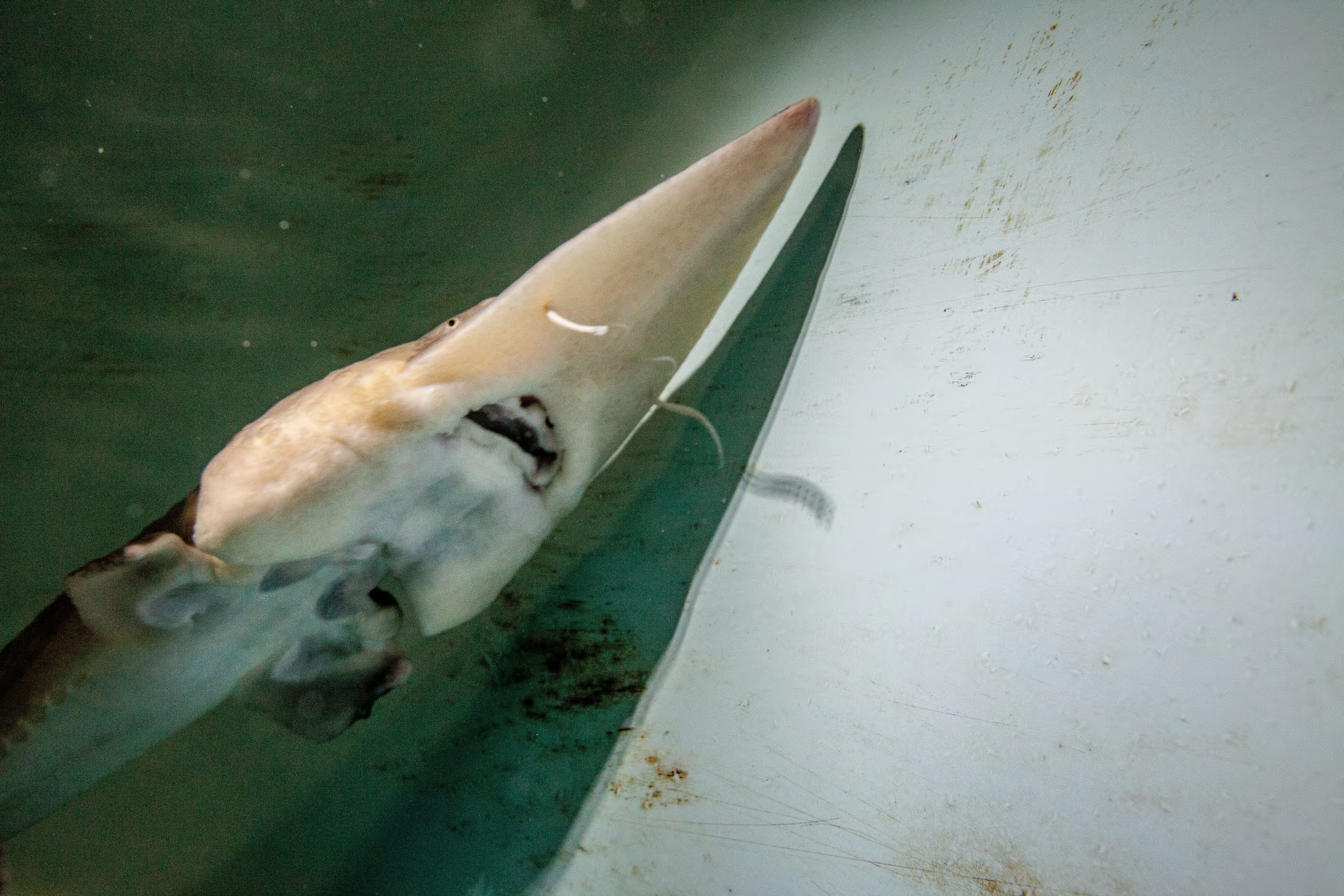 Pallid sturgeon have a flattened shovel-shaped snout; a long, slender, and completely armored caudal peduncle (the tapered portion of the body which terminates at the tail); and lack a spiracle (small openings found on each side of the head) (Forbes and Richardson 1905).