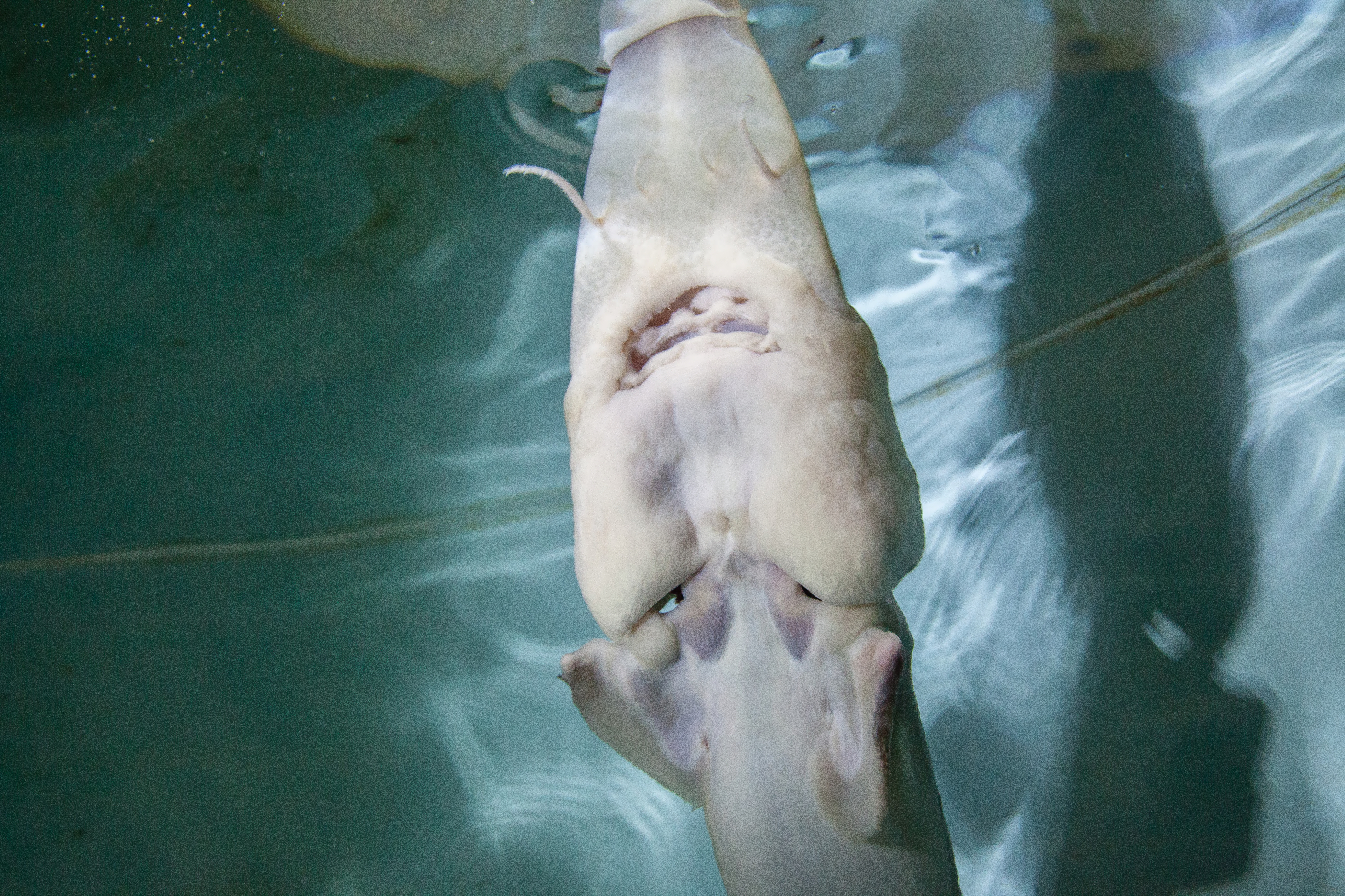Pallid sturgeon have a flattened shovel-shaped snout; a long, slender, and completely armored caudal peduncle (the tapered portion of the body which terminates at the tail); and lack a spiracle (small openings found on each side of the head) (Forbes and Richardson 1905).