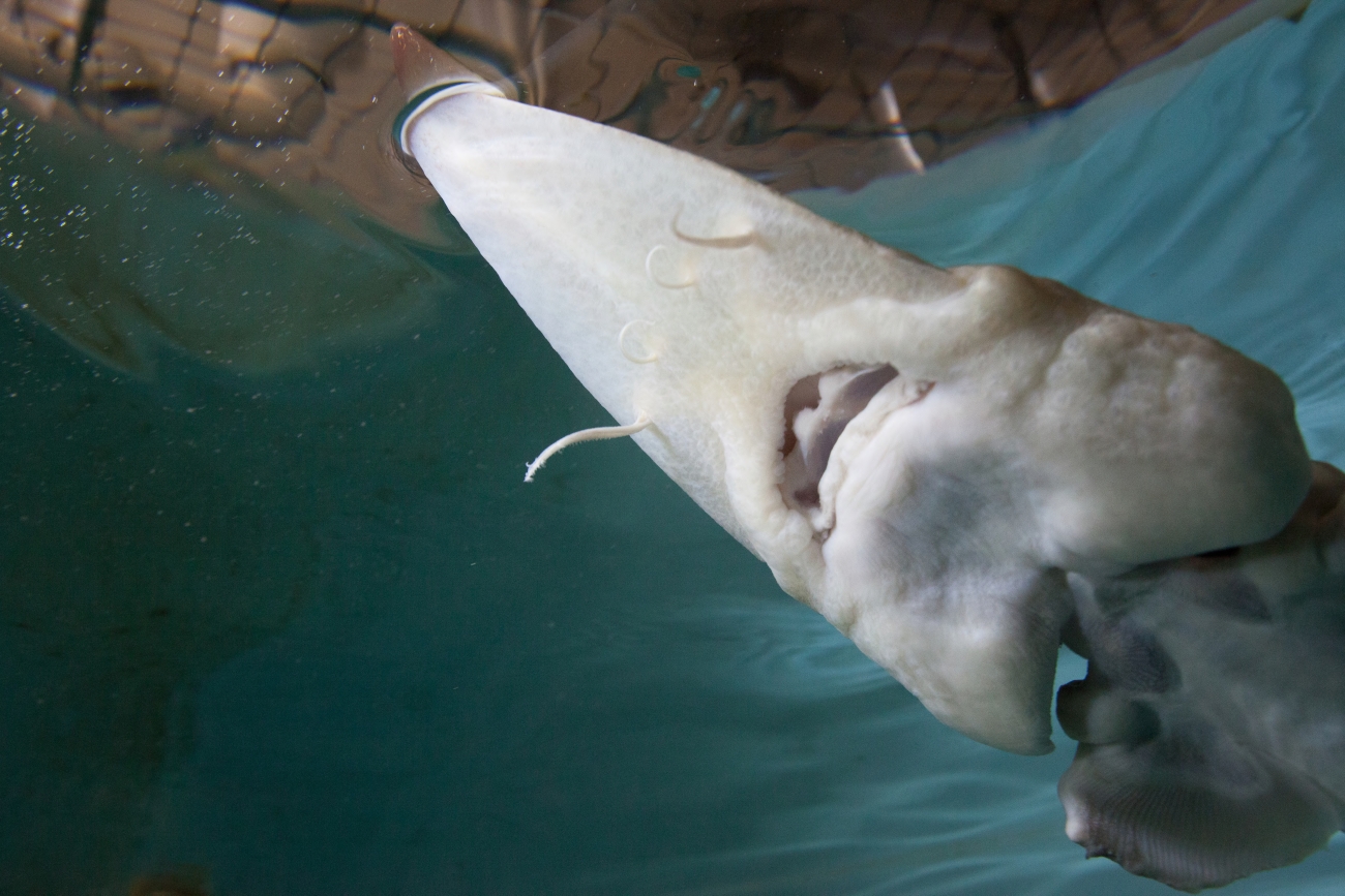 Pallid sturgeon have a flattened shovel-shaped snout; a long, slender, and completely armored caudal peduncle (the tapered portion of the body which terminates at the tail); and lack a spiracle (small openings found on each side of the head) (Forbes and Richardson 1905).
