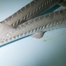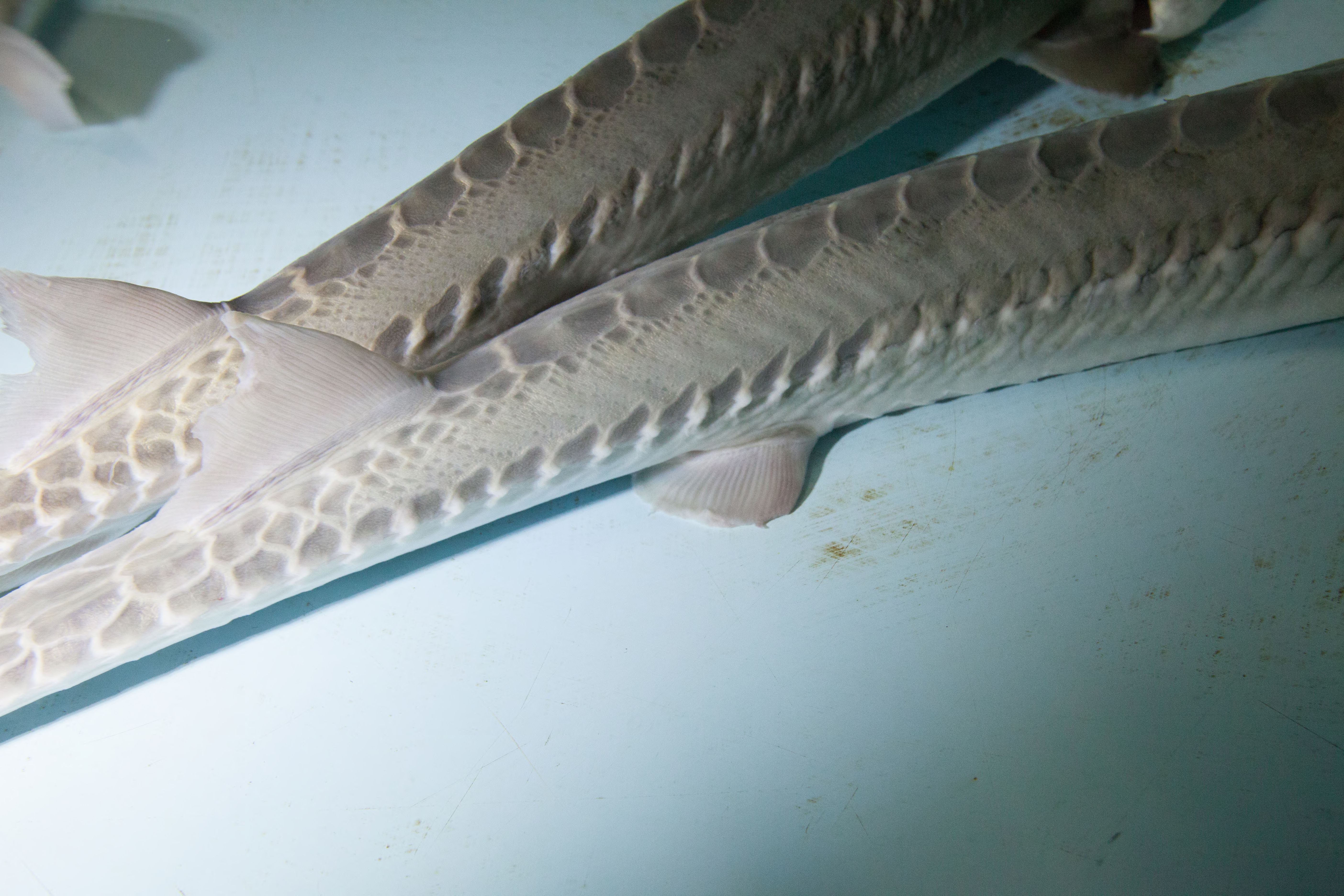 Pallid sturgeon have a flattened shovel-shaped snout; a long, slender, and completely armored caudal peduncle (the tapered portion of the body which terminates at the tail); and lack a spiracle (small openings found on each side of the head) (Forbes and Richardson 1905).