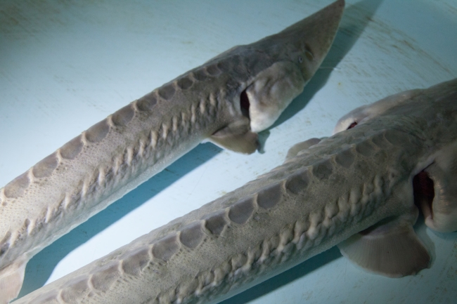 Pallid sturgeon have a flattened shovel-shaped snout; a long, slender, and completely armored caudal peduncle (the tapered portion of the body which terminates at the tail); and lack a spiracle (small openings found on each side of the head) (Forbes and Richardson 1905).