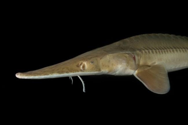 Pallid sturgeon at Gains Point NFH. The pallid sturgeon, federally listed as endangered, is an ancient fish that can live up to 50 years, grow up to 6 feet long and weigh up to 85 pounds. The construction of dams and dredging has caused river habitat to change, preventing the fish from reproducing. Pallid sturgeon require fast flowing water over a gravel or sand bottom to spawn.