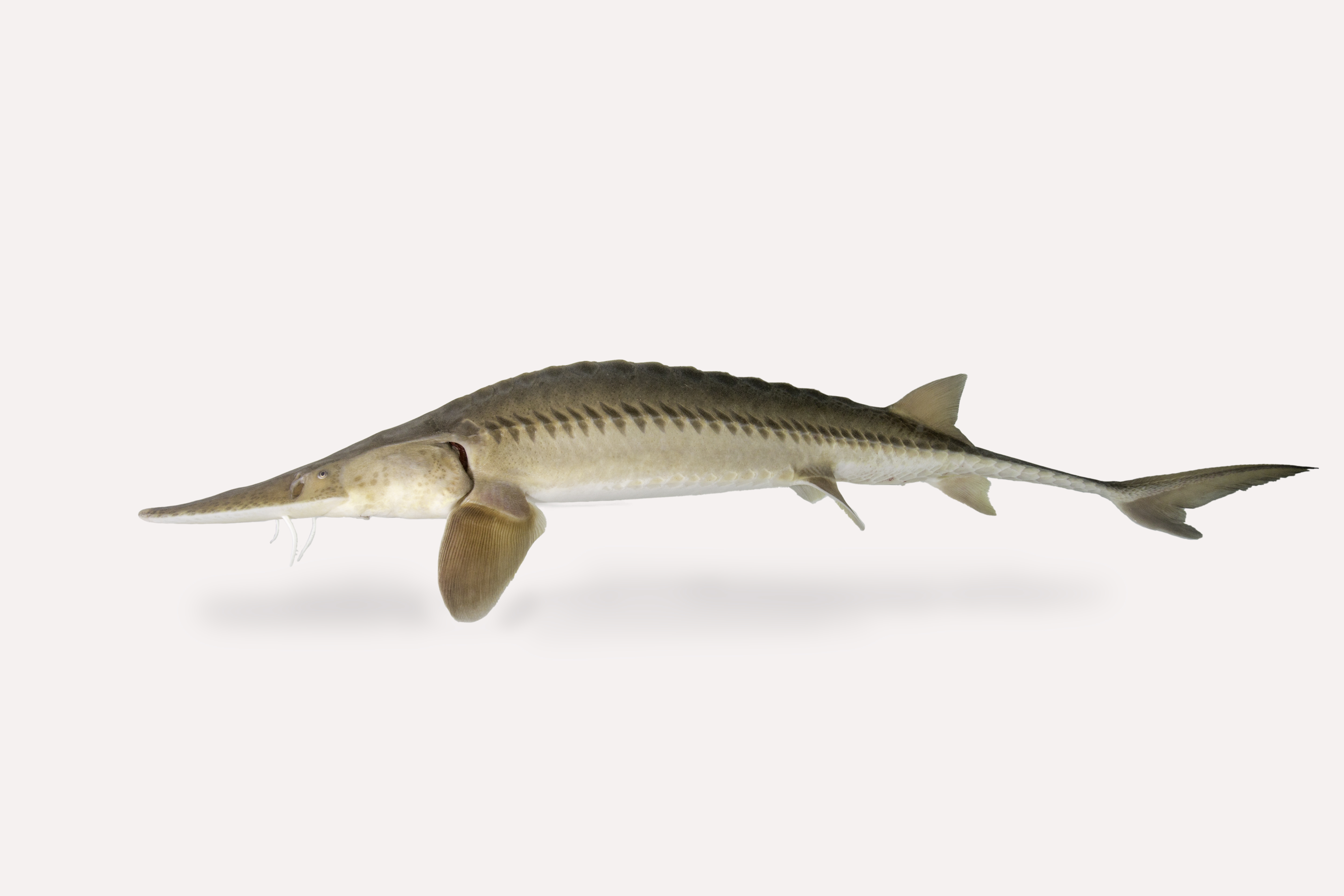 Pallid sturgeon with white background, horizontal position.