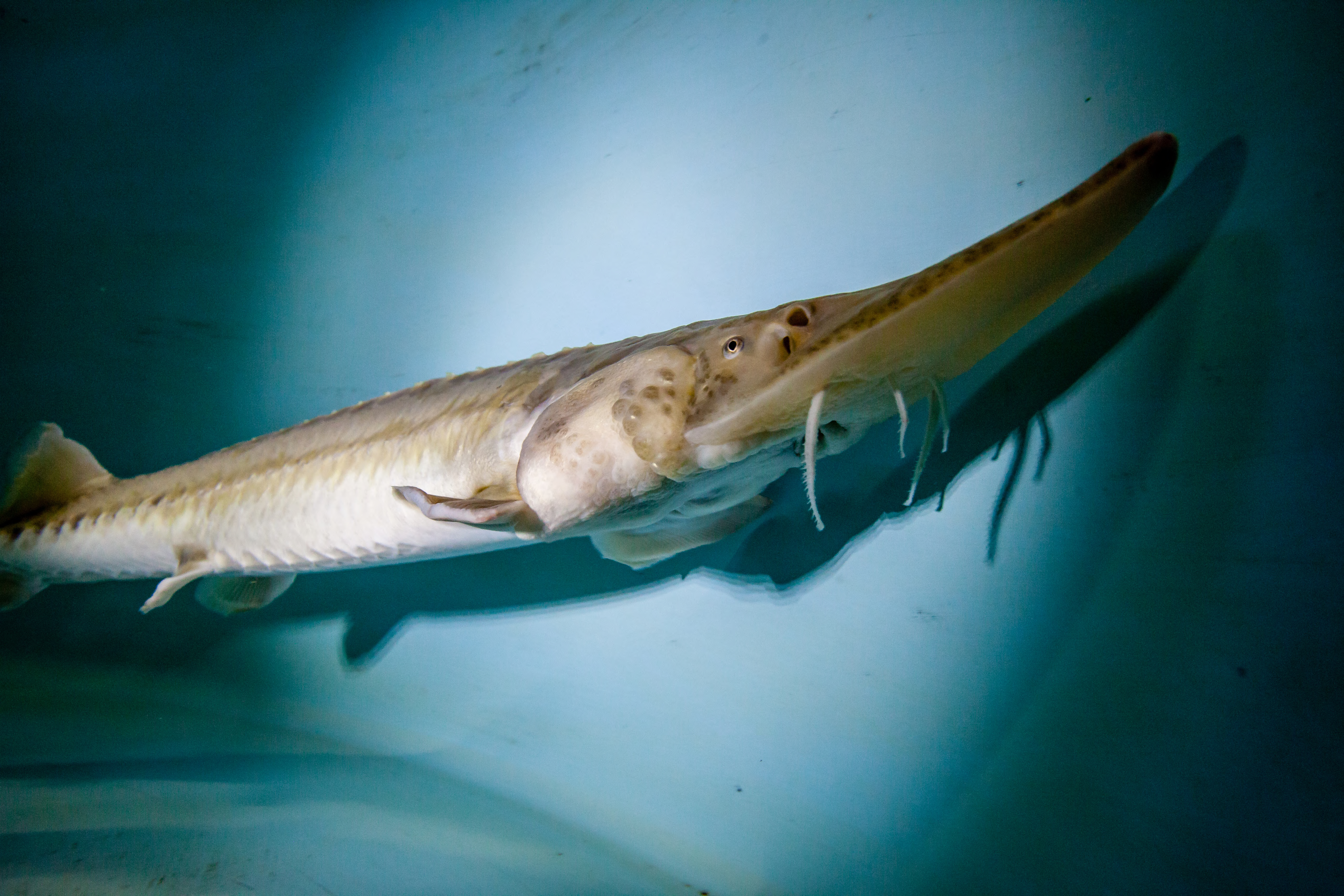 Pallid sturgeon have a flattened shovel-shaped snout; a long, slender, and completely armored caudal peduncle (the tapered portion of the body which terminates at the tail); and lack a spiracle (small openings found on each side of the head) (Forbes and Richardson 1905).