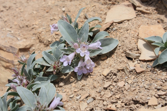 Penstemon debilis was discovered in 1986, and was first described by O’Kane and Anderson in 1987 (pp. 412–416). P. debilis is a mat-forming perennial herb with thick, succulent, bluish leaves, each about 0.8 in. (2 cm) long and 0.4 in. (1 cm) wide. Plants produce shoots that run along underground, forming what appear as new plants at short distances away. Individual P. debilis plants are able to survive on the steep, unstable, shale slopes by responding with stem elongation as leaves are buried by the shifting talus. Buried stems progressively elongate down slope from the initial point of rooting to a surface sufficiently stable to allow the development of a tuft of leaves and flowers (O’Kane and Anderson 1987, pp. 414–415). The funnel-shaped flowers are white to pale lavender, and bloom during June and July. P. debilis plants produce a small number of seeds that are dispersed by gravity.