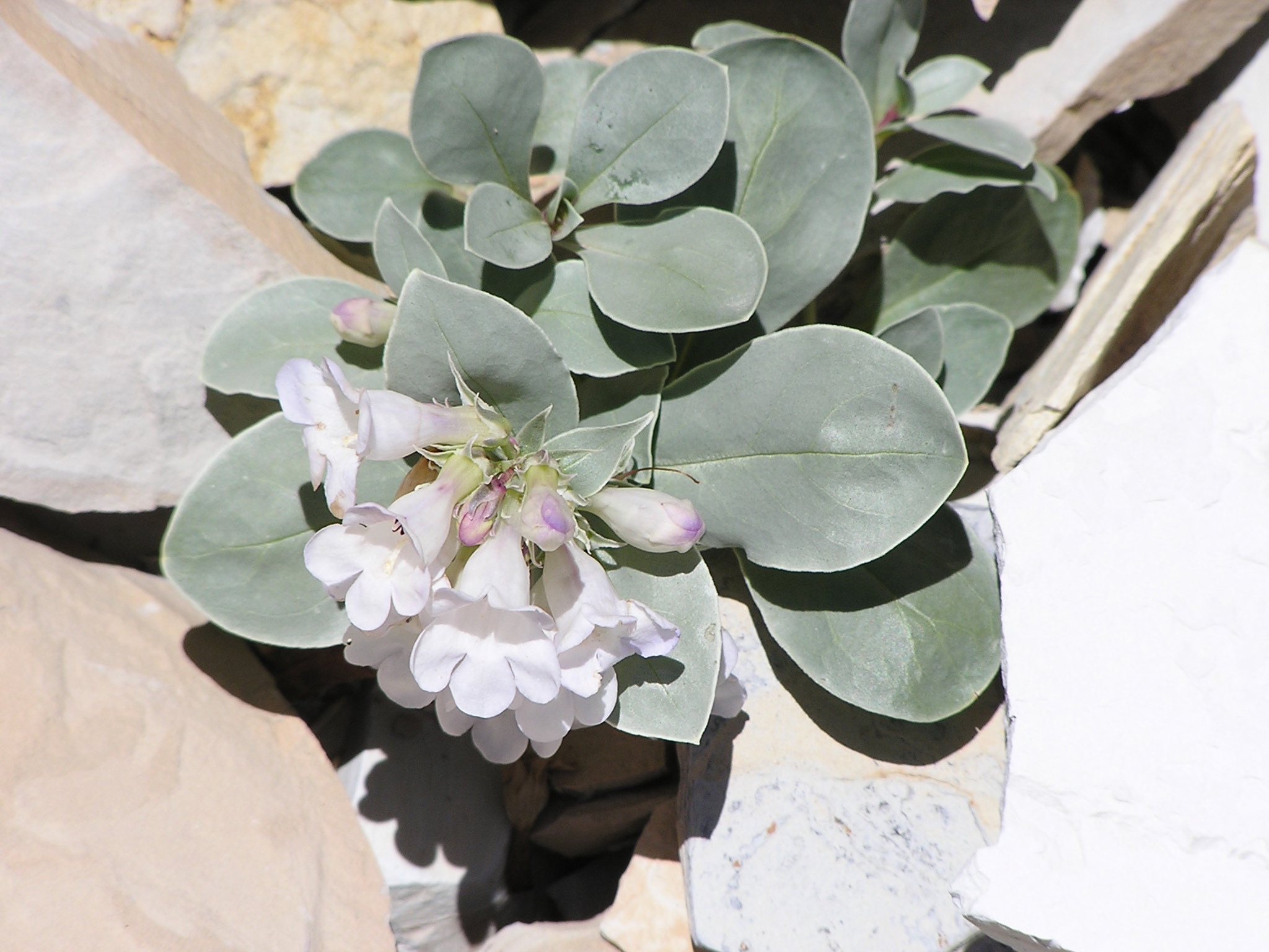 Penstemon debilis was discovered in 1986, and was first described by O’Kane and Anderson in 1987 (pp. 412–416). P. debilis is a mat-forming perennial herb with thick, succulent, bluish leaves, each about 0.8 in. (2 cm) long and 0.4 in. (1 cm) wide. Plants produce shoots that run along underground, forming what appear as new plants at short distances away. Individual P. debilis plants are able to survive on the steep, unstable, shale slopes by responding with stem elongation as leaves are buried by the shifting talus. Buried stems progressively elongate down slope from the initial point of rooting to a surface sufficiently stable to allow the development of a tuft of leaves and flowers (O’Kane and Anderson 1987, pp. 414–415). The funnel-shaped flowers are white to pale lavender, and bloom during June and July. P. debilis plants produce a small number of seeds that are dispersed by gravity.
