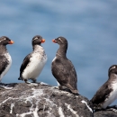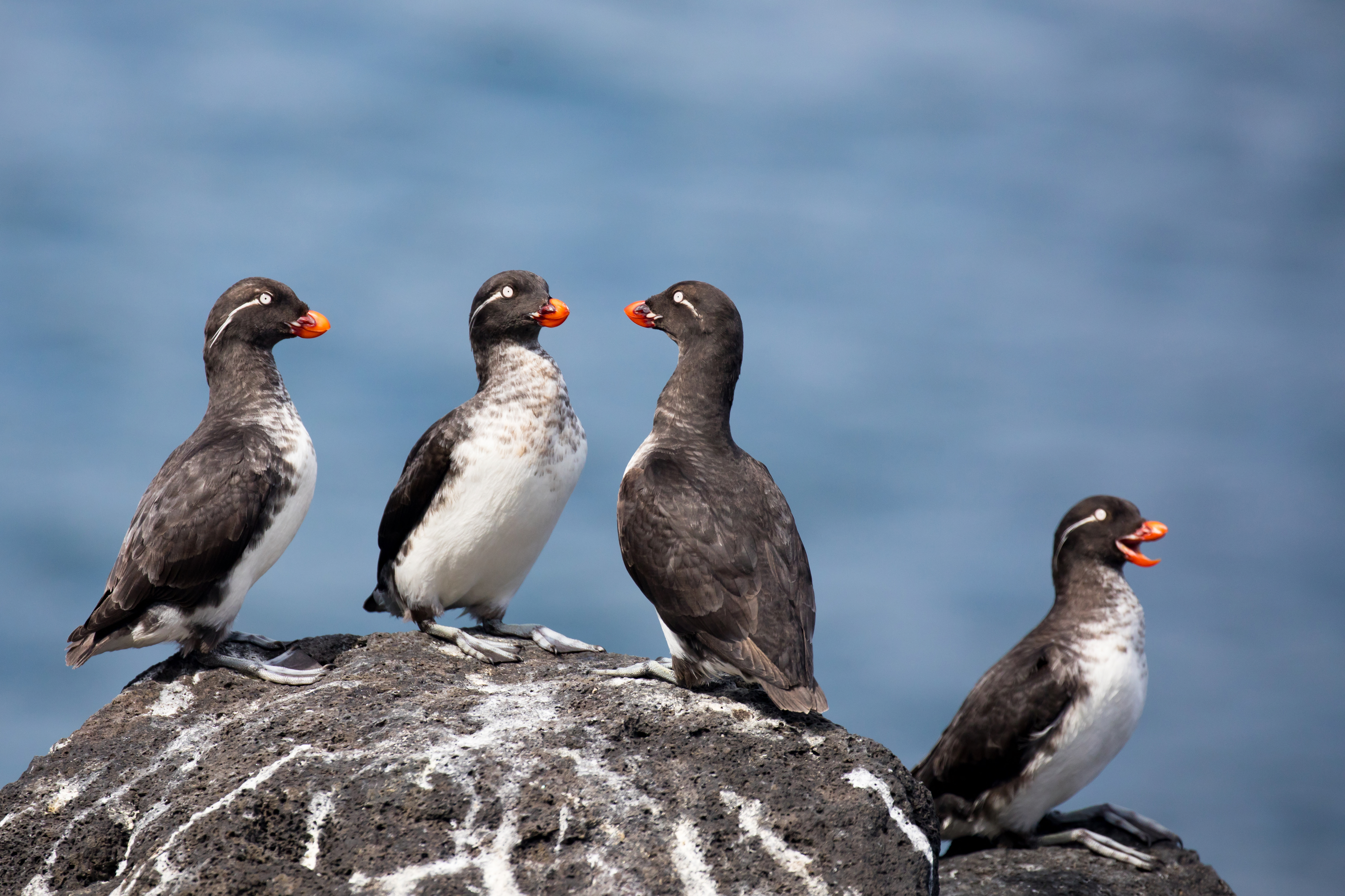 Parakeet auklet. Nests on sea cliffs. Parakeet auklet found in cold ocean waters in summer, but may move into more temperate seas in winter.