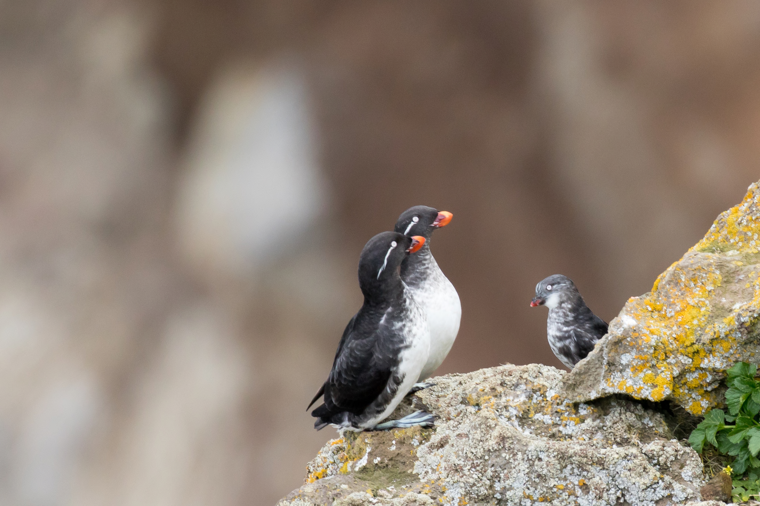 Parakeet auklet. Nests on sea cliffs. Parakeet auklet found in cold ocean waters in summer, but may move into more temperate seas in winter.