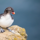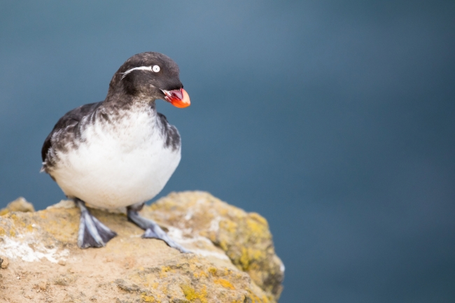 Parakeet auklet. Nests on sea cliffs. Parakeet auklet found in cold ocean waters in summer, but may move into more temperate seas in winter.