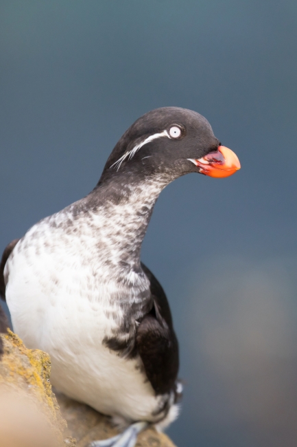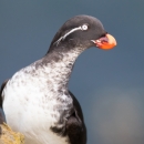 Parakeet auklet. Nests on sea cliffs. Parakeet auklet found in cold ocean waters in summer, but may move into more temperate seas in winter.