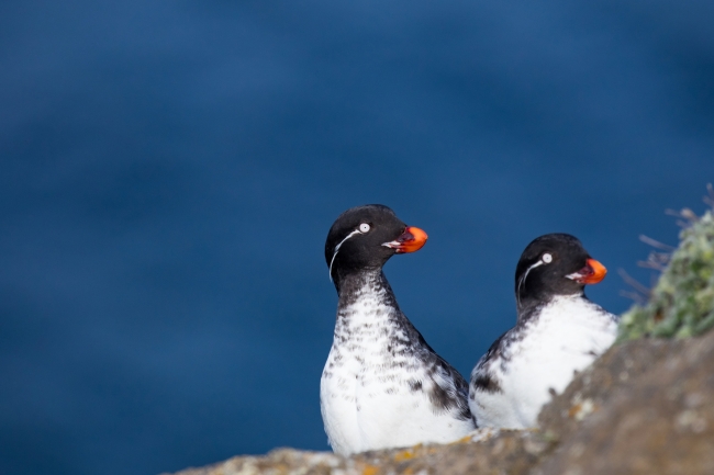 Parakeet auklet. Nests on sea cliffs. Parakeet auklet found in cold ocean waters in summer, but may move into more temperate seas in winter.