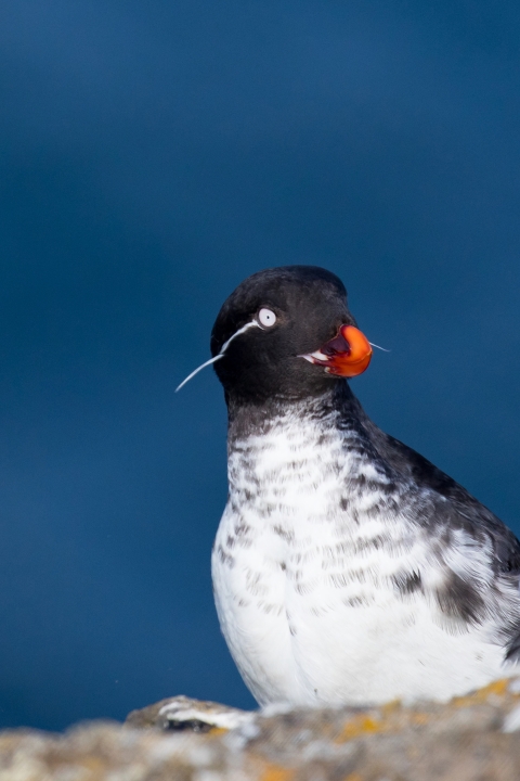Parakeet auklet. Nests on sea cliffs. Parakeet auklet found in cold ocean waters in summer, but may move into more temperate seas in winter.