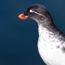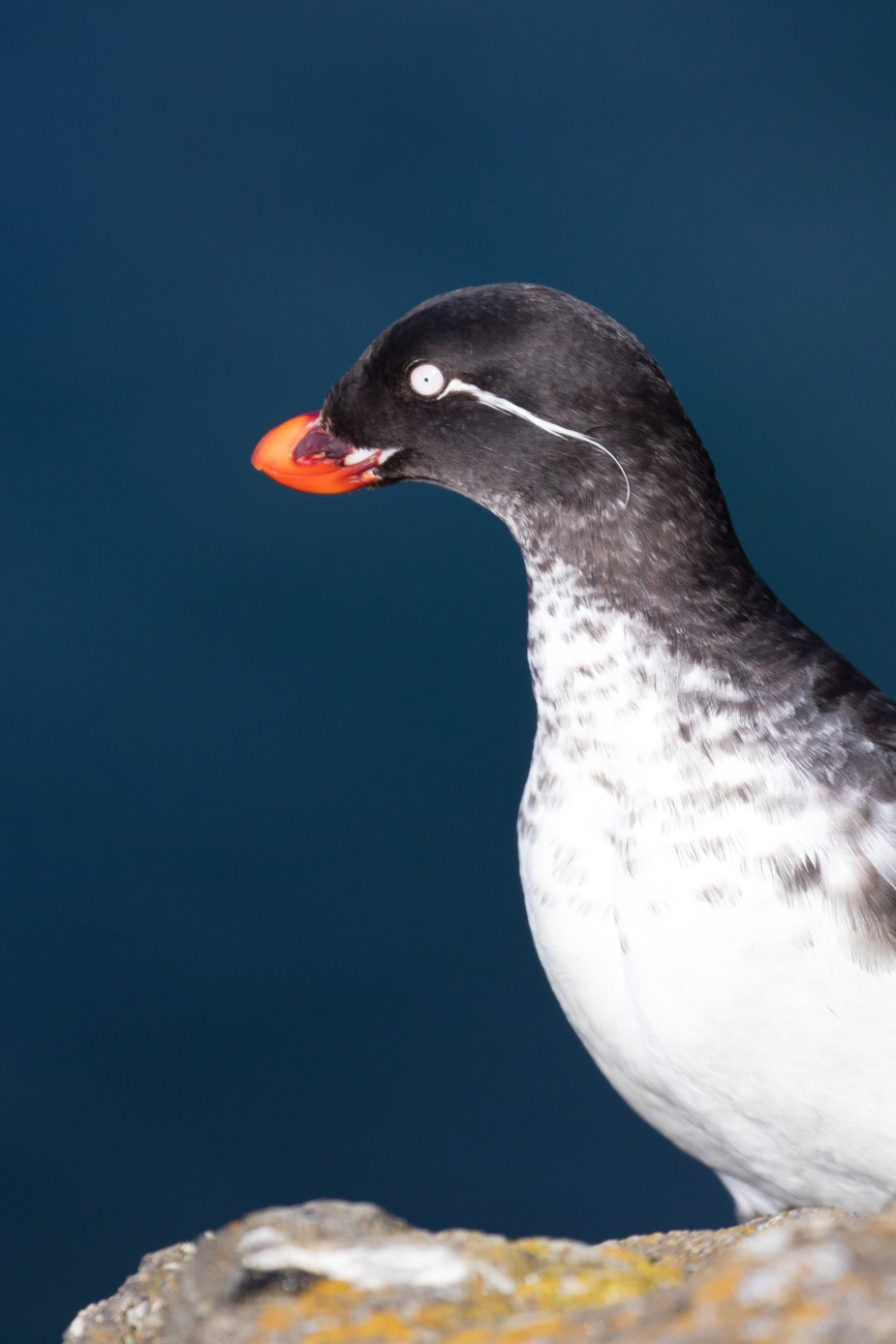 Parakeet auklet. Nests on sea cliffs. Parakeet auklet found in cold ocean waters in summer, but may move into more temperate seas in winter.
