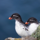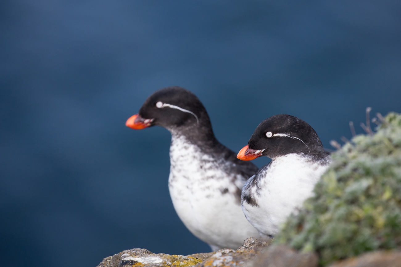 Parakeet auklet. Nests on sea cliffs. Parakeet auklet found in cold ocean waters in summer, but may move into more temperate seas in winter.