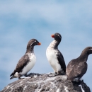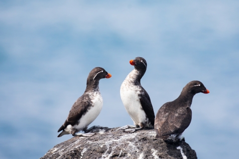 Parakeet auklets perched on rocks.Nests on sea cliffs. Parakeet auklet found in cold ocean waters in summer, but may move into more temperate seas in winter.