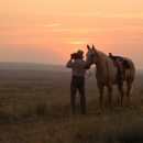 A Park Ranger is patrolling by horseback at sunset.