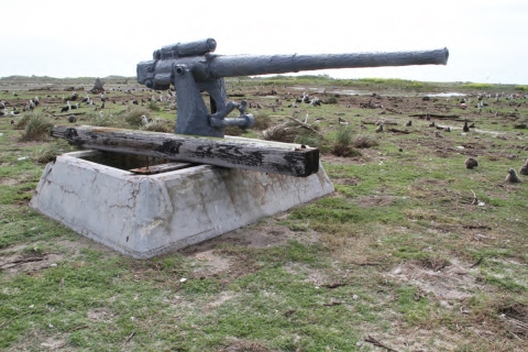 Part of a pier was washed inland onto a gun on Eastern Island after a tsunami generated by a powerful earthquake off the coast of Japan struck the refuge at 11:36 PM on Thursday, March 10th and continued for the next few hours. While Spit Island was completely washed over, Eastern and Sand Island were 60% and 20% washed over, respectively. Image taken from USFWS Pacific Region Flickr page.