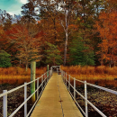 A boardwalk leads to a colorful forest at Patuxent Research Refuge in Maryland.