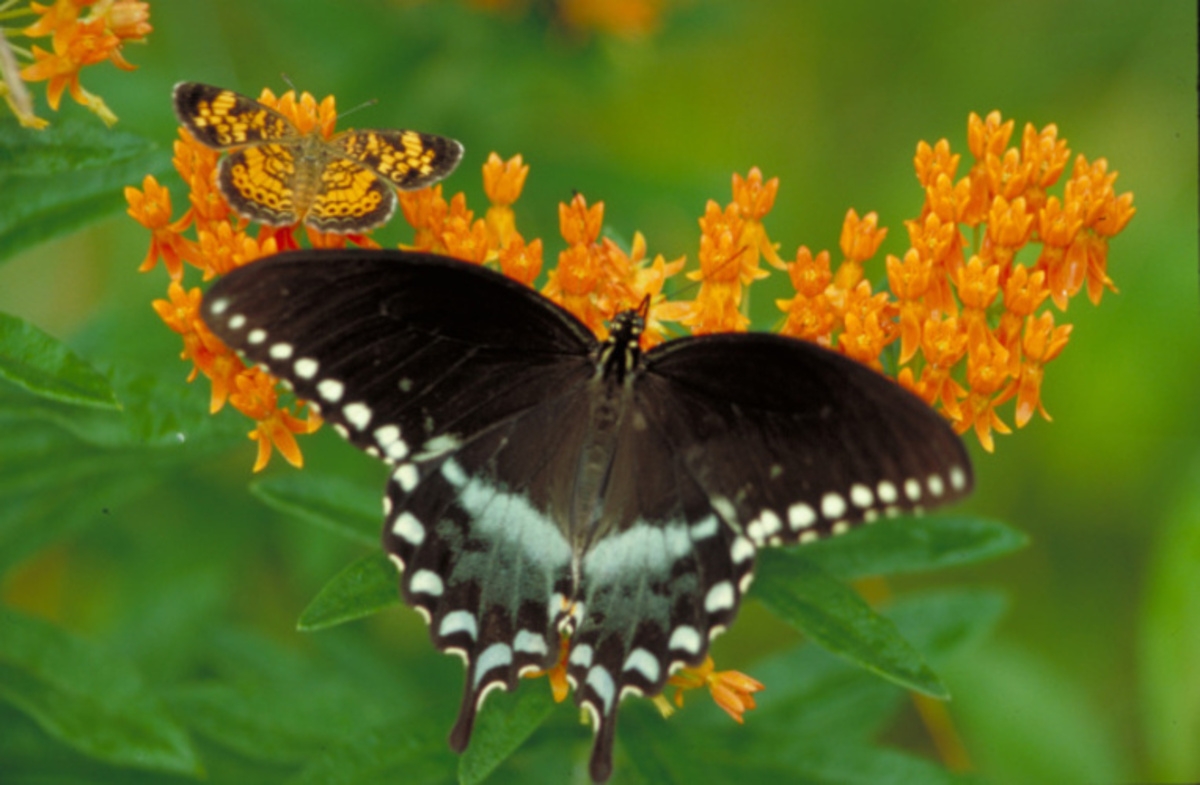 Large black butterfly with blue white accents, also called Black swallowtail, and small orange yellow and brown butterfly, both on Butterfly weed with wings open, viewed from above.