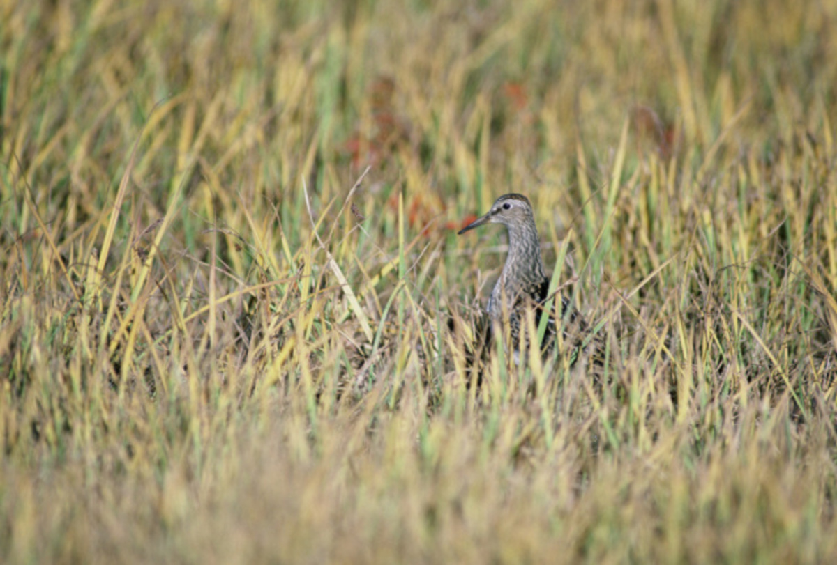 Sandpiper standing in tall grass; blends into grasses. Womans Bay on Kodiak Island, Alaska. For more information about shorebirds visit http://www.fws.gov/birds/.