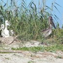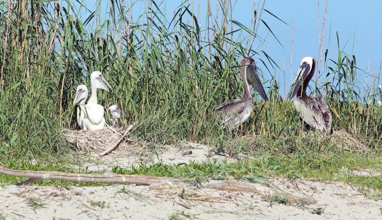 Pelican chicks sit on a nest near adult pelicans at Breton National Wildlife Refuge in Louisiana after a major restoration of Breton island in 2022 meant to help undo harm from erosion and the Deepwater Horizon oil spill of 2010.