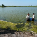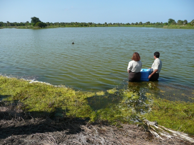 U.S. Fish and Wildlife veterinarian Sharon Taylor and Charlie Pelizza, refuge manager at Pelican Island National Wildlife Refuge, release a Northern Gannet that had been oiled and cleaned at Pelican Island on Monday May 10.