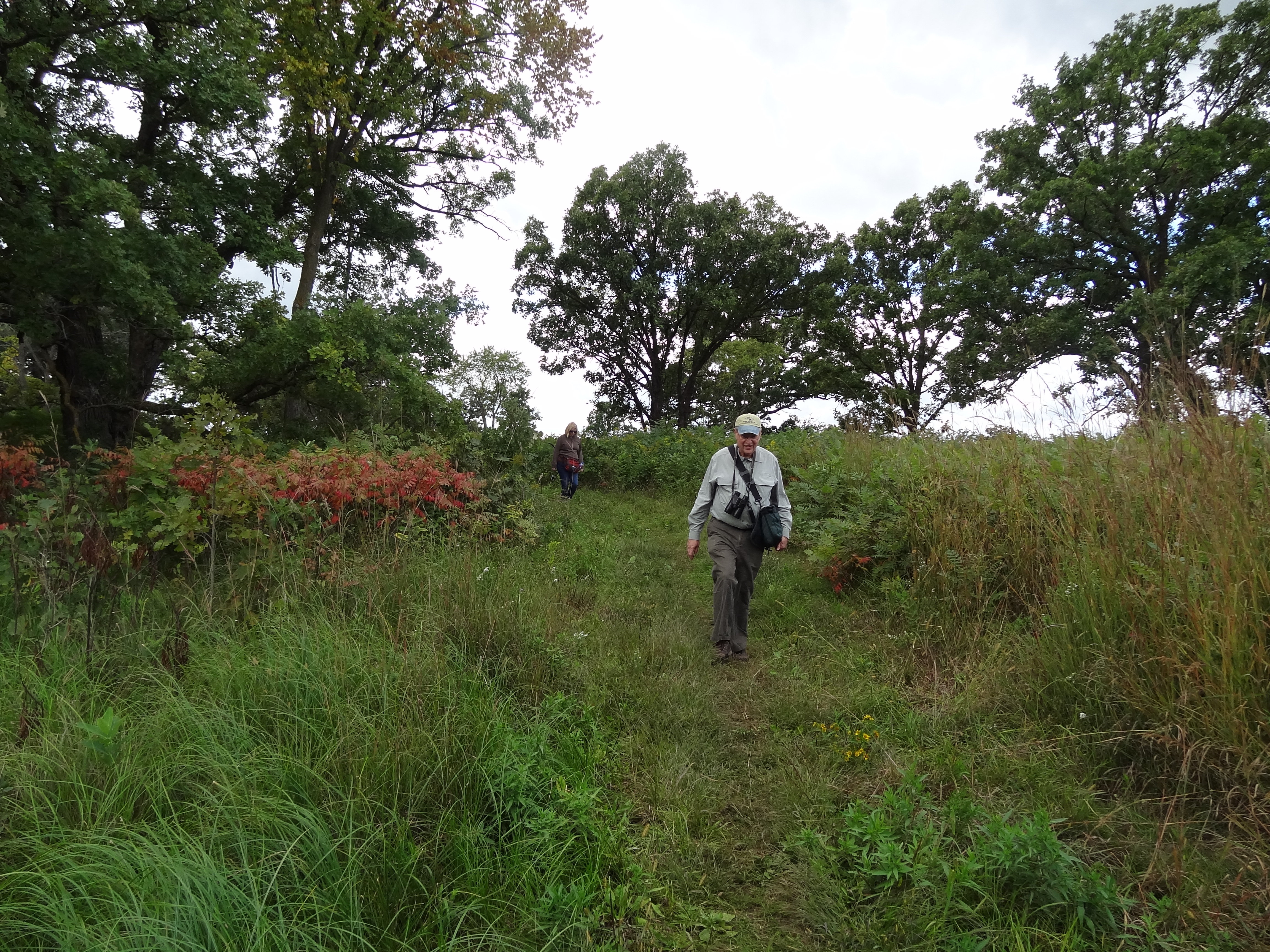 People walk through oak trees at the Louisville Swamp Unit at Minnesota Valley National Wildlife Refuge.