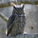 A great horned owl rests on a large branch with the afternoon sun at its back at the Julia Butler Hansen Refuge for Columbian White-tailed Deer in southwest Washington, April 6, 2021.