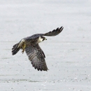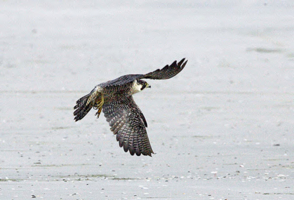 Peregrine falcon in flight over Blackwater National Wildlife Refuge, MD.