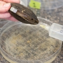 A metal bolt can be used to hold the two valves apart while the syringe is inserted. The Petri dish below captures the harvested glochidia.
