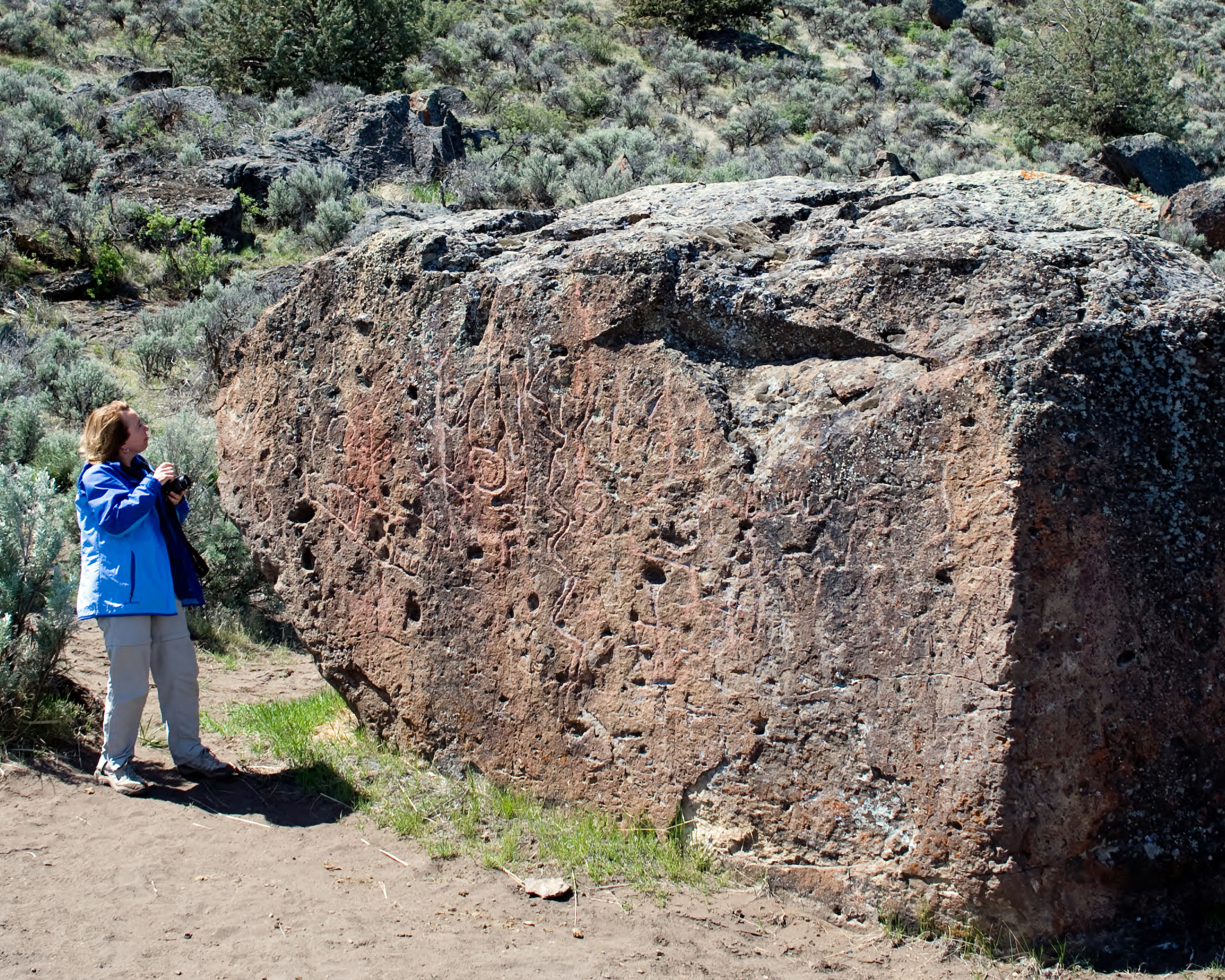 Sallie Gentry, Fish and Wildlife Service employee observes petroglyphs etched into a rock at Malheur National Wildlife Refuge.