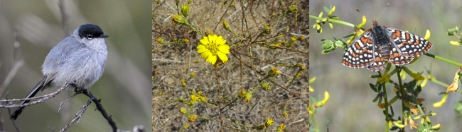 The federally threatened coastal California gnatcatcher, endangered Otay tarplant, and Quino checkerspot butterfly. Both the gnatcatcher and tarplant have designated critical habitat boundaries on Mother Miguel Mountain, which guides much of the management priorities for the wildlife refuge. Credit: Coastal California gnatcatcher by Kevin Hamm/USFWS; flowering Otay tarplant by John Martin/USFWS; Quino checkerspot butterfly by Lisa Cox/USFWS