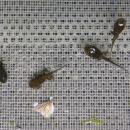 A photo of Wyoming toadlets and tadpoles growing at the Saratoga Fish Hatchery. An aerial view shows four tadpoles in shallow water, they have started to develop legs but still have long tails.