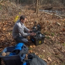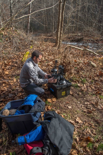 Photographer checking over camera equipment before dive, Seneca Creek, WV.
