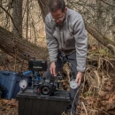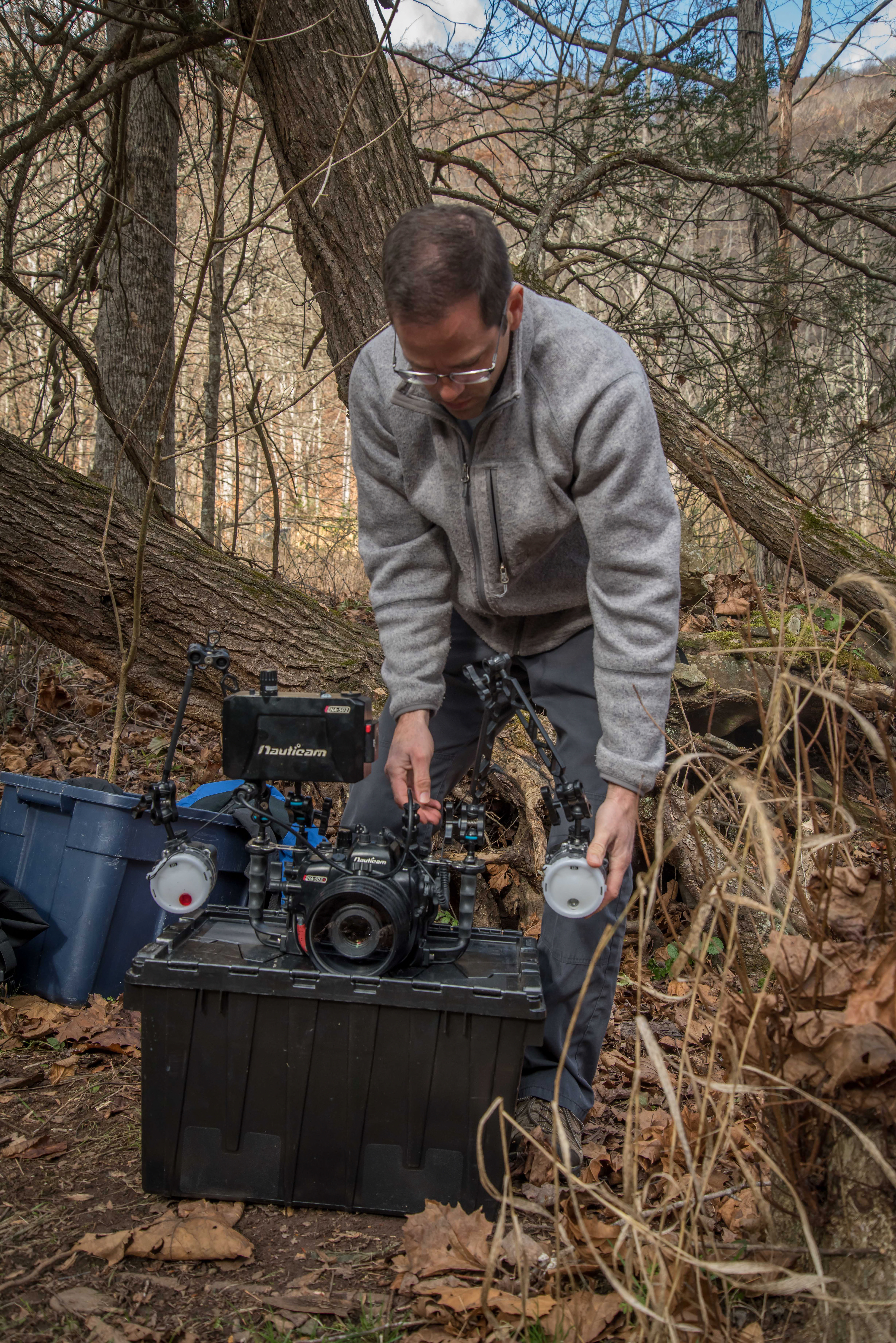 Photographer getting underwater camera equipment ready for dive. Dive at Seneca Creek for brook trout.