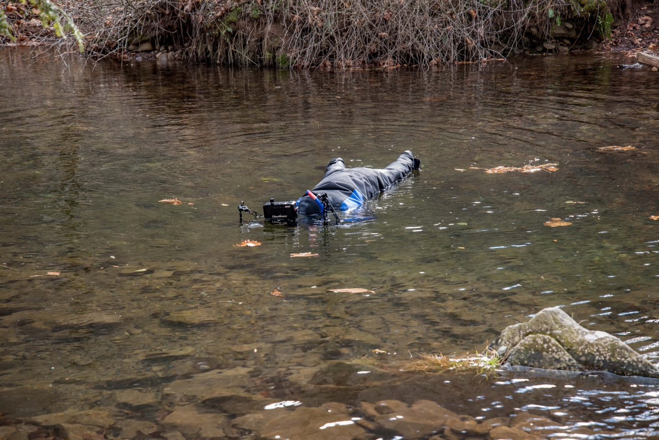 Photographer taking pictures of brook trout in Seneca Creek