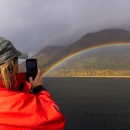 KT Tunstall, musician in residence at Kodiak National Wildlife Refuge, takes a photo of a rainbow arcing across Karluk Lake and surrounding mountains.