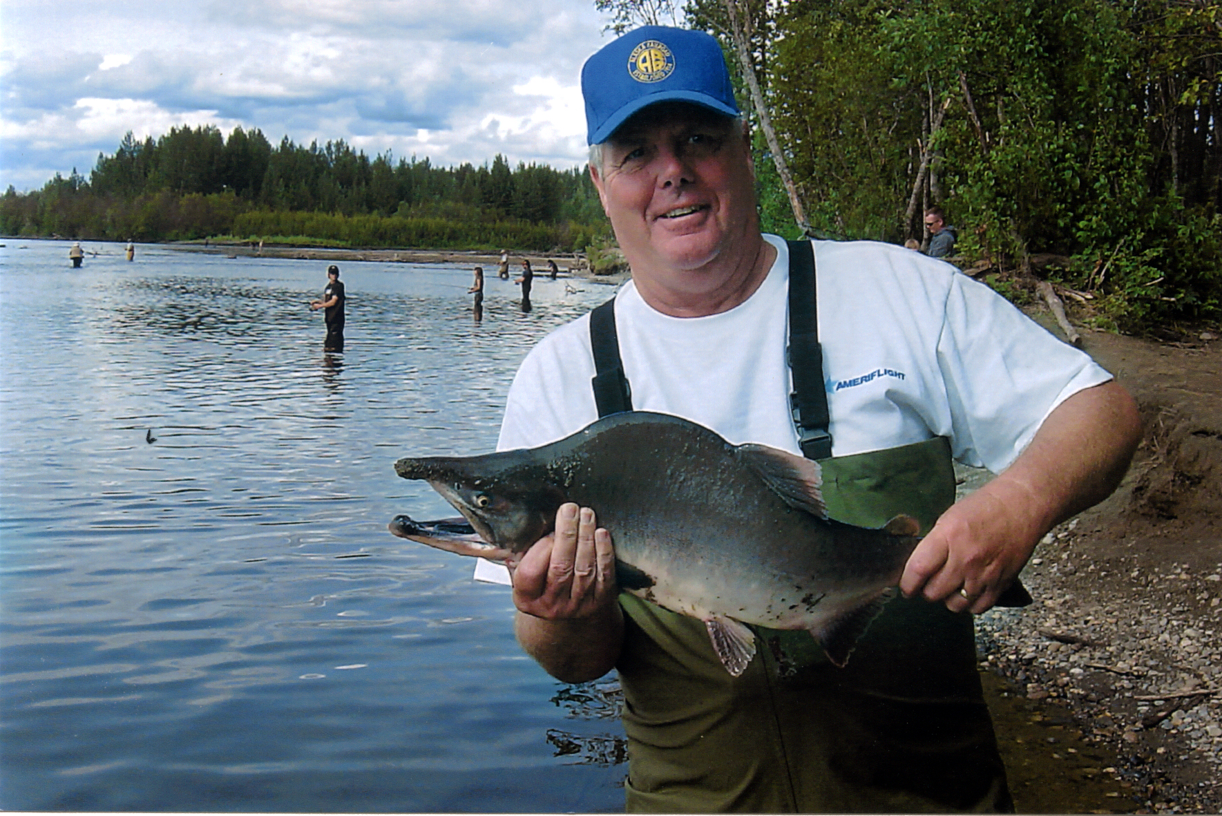 David Warnberg with a nice pink salmon caught in Alexander Creek, Alaska. The pink is also known as the Humpy. You can see where this salmon gets the nickname when you look at this large male specimen. The pink is an aggressive fish and is known for it's