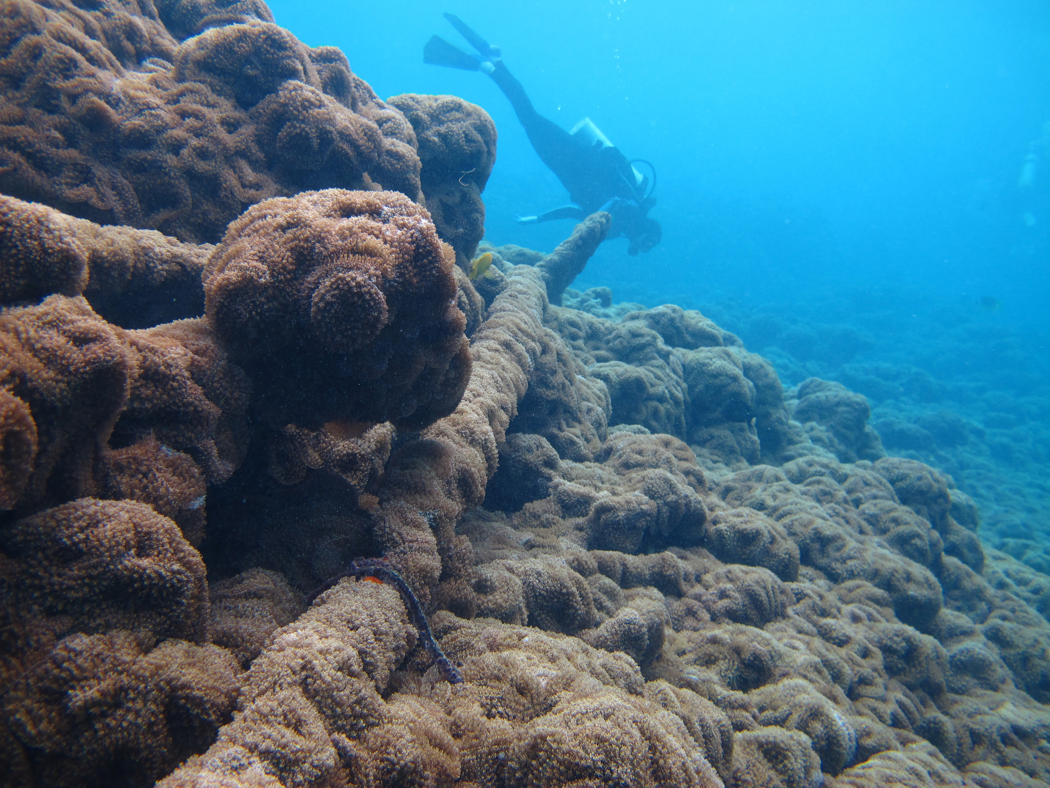 Pipes and other wreck debris at Palmyra Atoll National Wildlife Refuge is carpeted by the invasive corallimorph that is gaining nutrients from the wreck's iron. The diver in the background serves as a size scale. Palmyra Atoll National Wildlife Refuge is home to some of the most pristine coral reefs in the world, but portions of the reef were being smothered by an invasive organism as it gained nutrients from the iron leaching off shipwrecks. Removing the wrecks gives the reef its best chance to resist impacts of global climate and oceanographic changes into the future.
