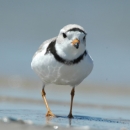 Piping plover walking on a New Jersey beach. The piping plover is a small, stocky, sandy-colored bird resembling a sandpiper. The adult has yellow-orange legs, a black band across the forehead from eye to eye, and a black ring around the base of its neck. Like other plovers, it runs in short starts and stops. When still, the piping plover blends into the pale background of open, sandy habitat on outer beaches where it feeds and nests. The bird's name derives from its call notes, plaintive bell-like whistles which are often heard before the birds are seen.
