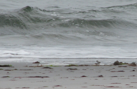 Piping Plover chick looks so small in comparison to the size of the wave behind him.