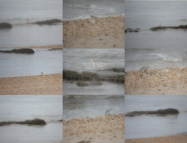 A composite of 9 blurry images of the bay, sandy gravel beach, and tube-building worm reef. All images contain a small sandy-colored bird. Some of the images contain an additional gray and white bird in the background.